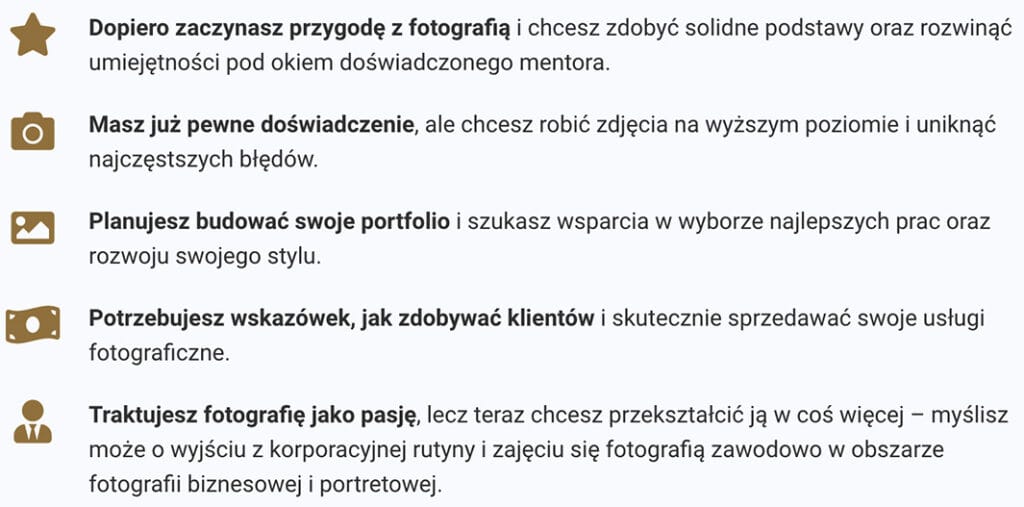 Otrzymasz praktyczne porady, które możesz od razu wdrożyć i dalej, na wyższe fotograficzne i biznesowe poziomy!